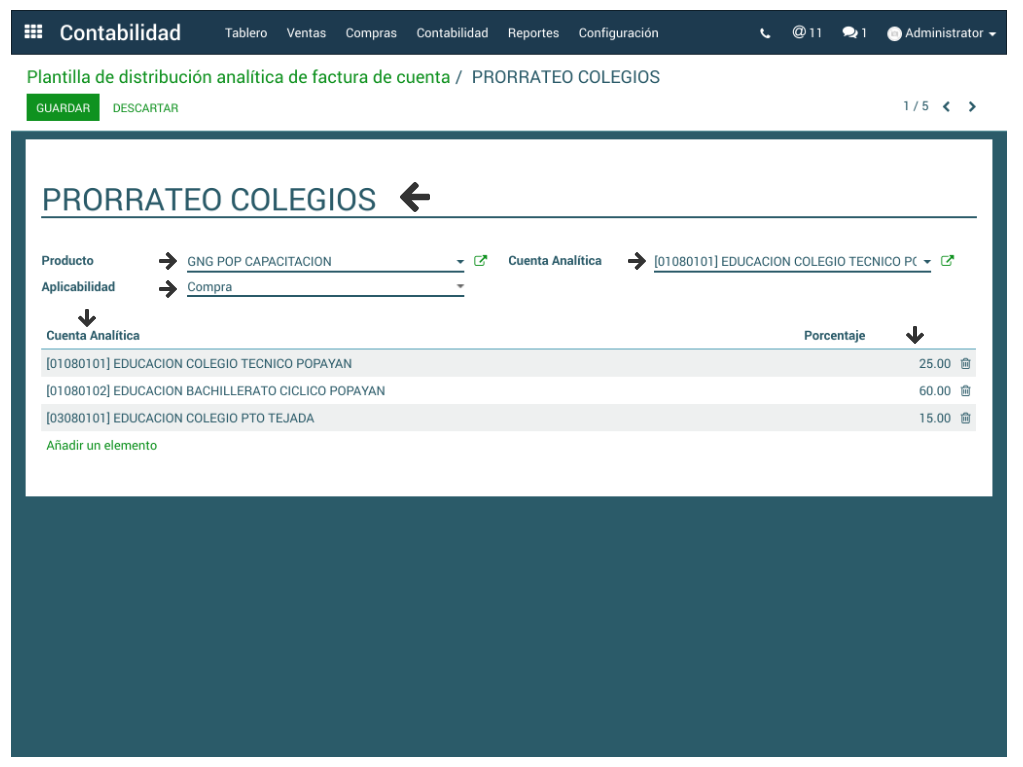 4. En la sección Cuenta Analítica se definen las cuenta analíticas destino y los porcentajes para cada una de ellas. Clic en Guardar.