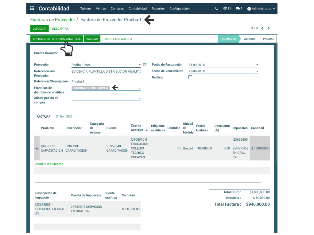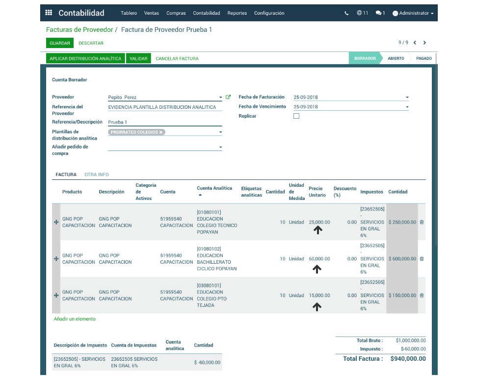 Se crea la Factura Proveedor o Cliente según corresponda. En el campo Plantilla de Distribución Analítica se elige la plantilla de distribución y en las líneas de factura se debe seleccionar el producto y la cuenta analítica que se configuró en la plantilla. Una vez digitada la cantidad, impuestos y demás, debe darse clic en el botón Aplicar Distribución Analítica.
