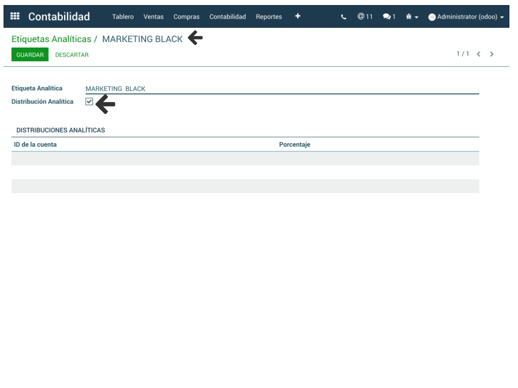 En primer lugar se debe verificar que en la configuración de la Etiqueta Analítica se encuentre activado el campo Distribución Analítica, de esta manera se activa la etiqueta para que reciba el porcentaje definido para ella desde la cuenta analítica.