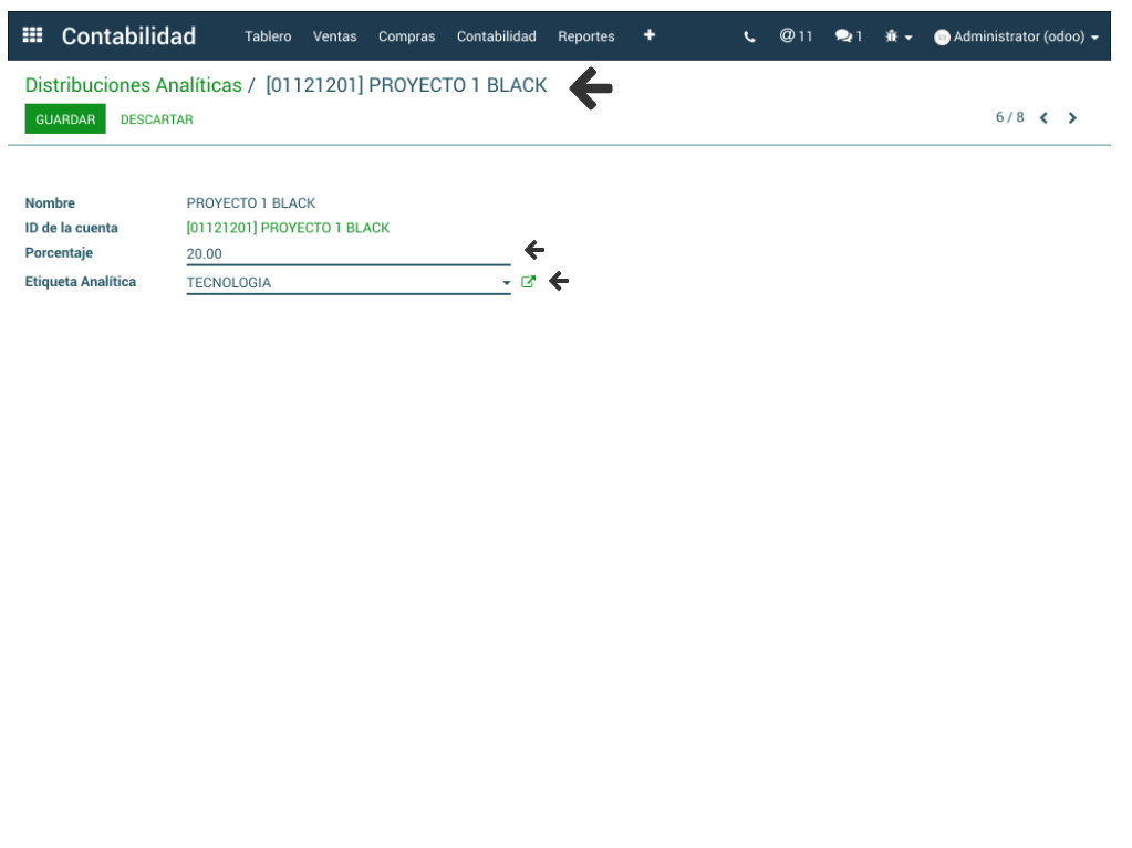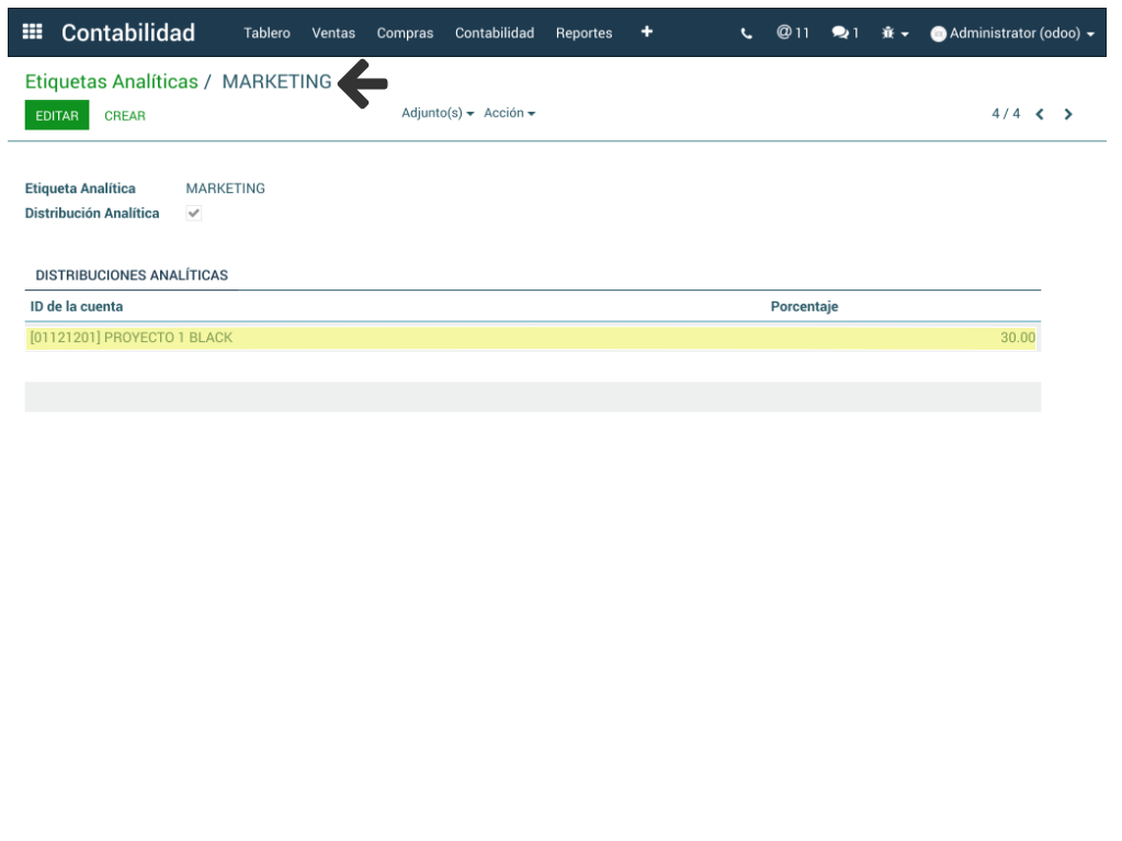 En ese mismo sub-menú pero en la opción Distribuciones Analíticas se puede visualizar el listado de las etiquetas analíticas, dando clic sobre una en particular el sistema permite su edición en cuanto a porcentaje y etiqueta analítica.