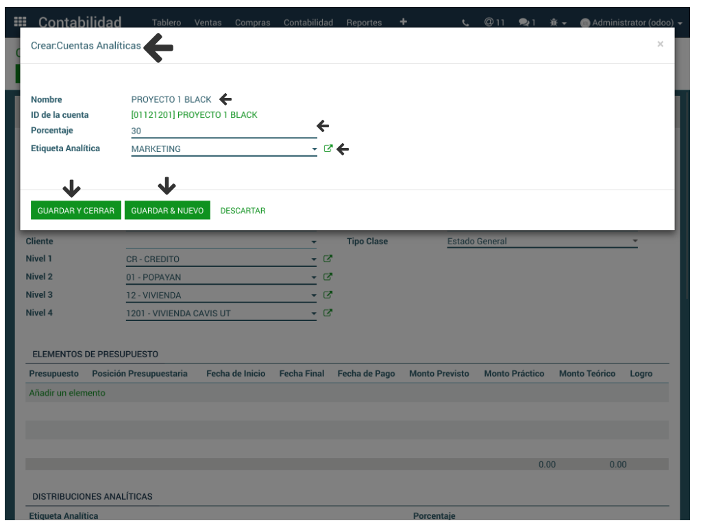 Desde la Cuenta Analítica en la sección de Distribuciones Analíticas se da clic en Añadir Elemento. En el formulario emergente se debe definir el porcentaje y la etiqueta analítica. Clic en Guardar y Cerrar o Guardar y Nuevo para asociar más etiquetas analíticas.