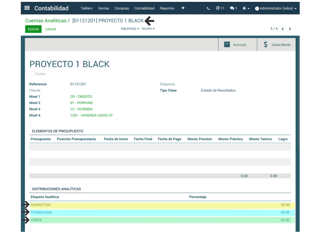 Así mismo, las etiquetas analíticas muestran las cuentas analíticas a las que se encuentran vinculadas y su porcentaje de distribución.