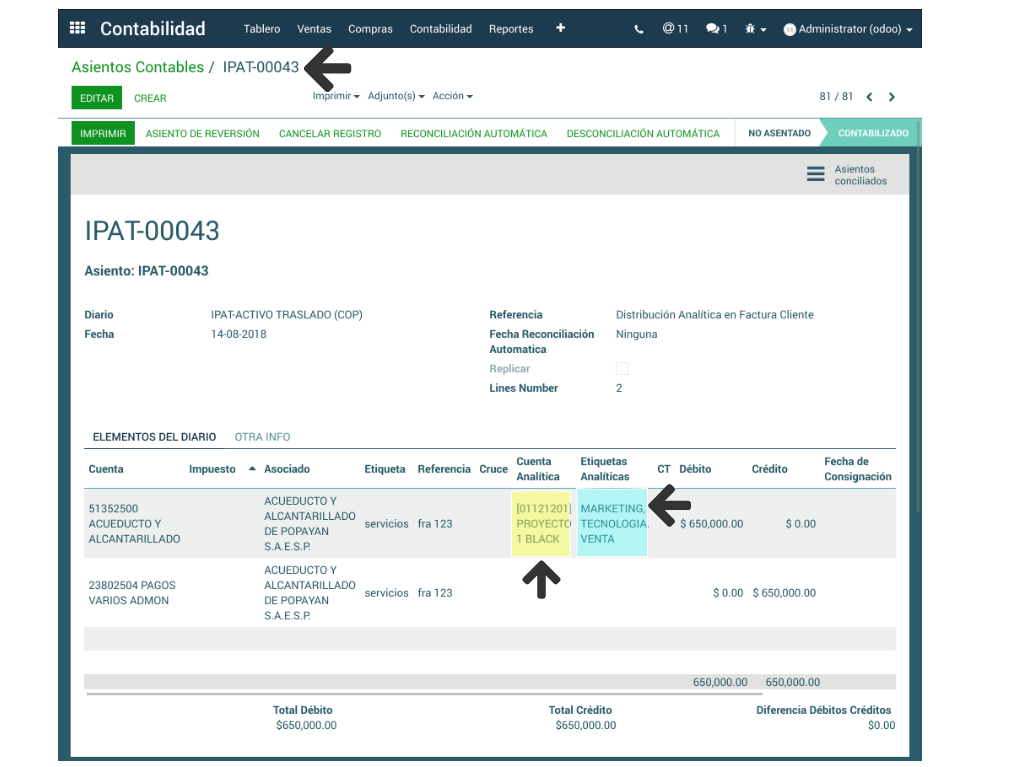 La Distribución Analítica se encuentra disponible para ser utilizada en Factura Cliente, Factura de Proveedor o Asientos Contables y está incluida en el proceso general de registro; solo consiste en seleccionar en la línea de registro las etiquetas que se encuentran enlazadas a la cuenta analítica. Se da clic en Guardar o Contabilizar.