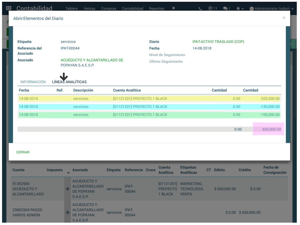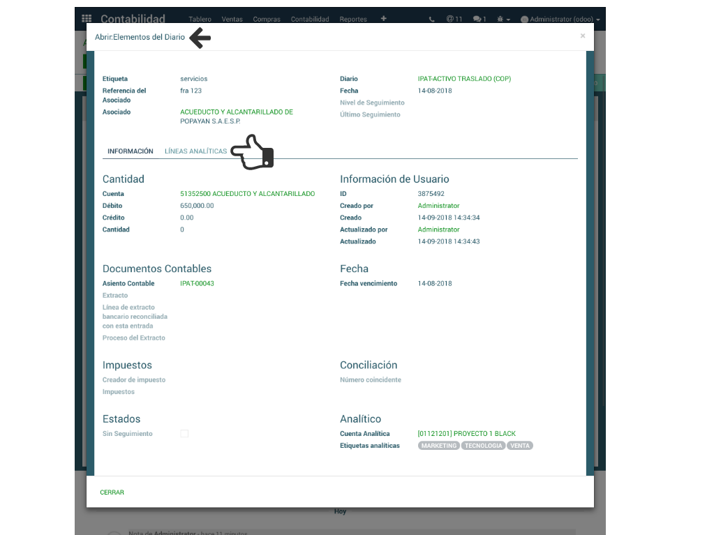 Se da clic sobre la línea que contiene las etiquetas analíticas dando origen a la pantalla de Elementos del Diario donde se hace clic en la pestaña Líneas Analíticas