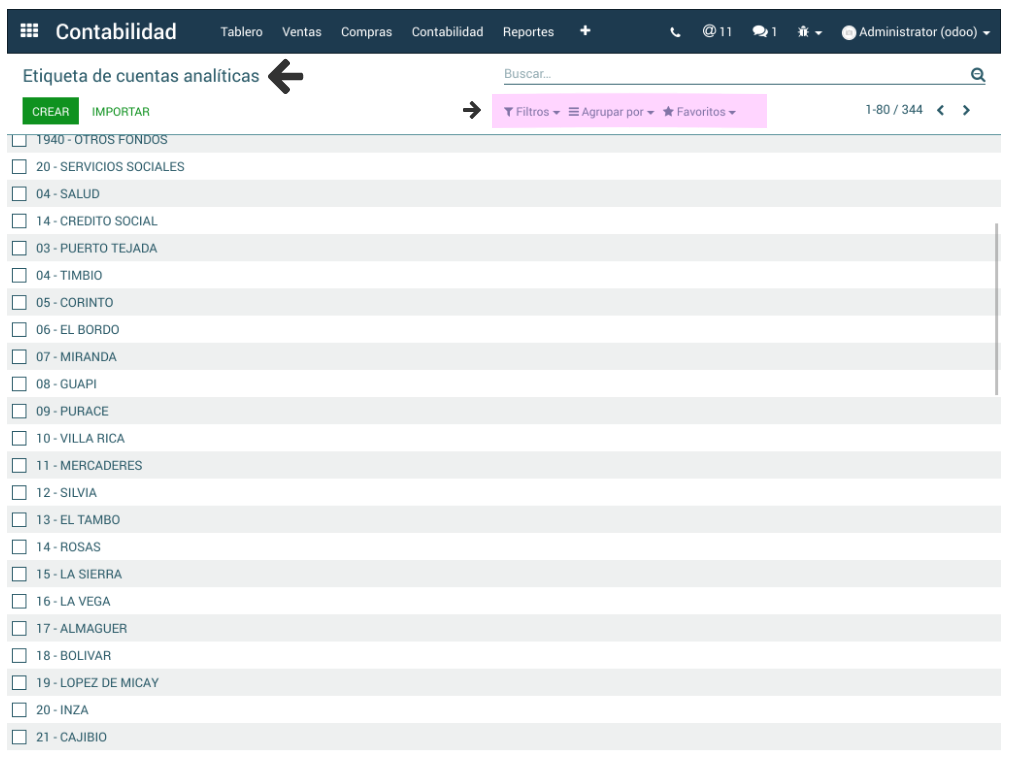 En la ruta Contabilidad > Configuración > Sub-menú Contabilidad Analítica > se encuentra la opción Etiqueta de Cuentas Analíticas donde se visualiza el listado de las diferentes etiquetas, pudiendo utilizar la opción de filtros para una búsqueda específica.