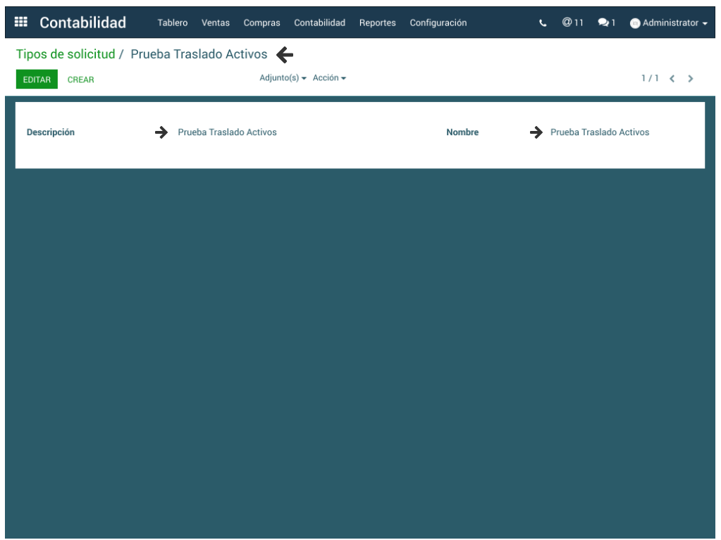 > Contabilidad > Configuración > Trámite de Traslado de Activos > Tipo de Solicitud