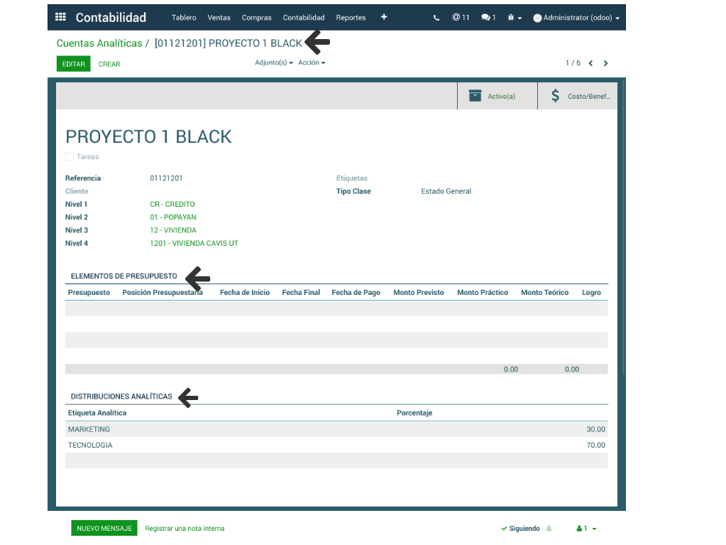 - Si la cuenta analítica presenta algún Presupuesto asociado éste se visualiza en la sección de Elementos de Presupuesto.