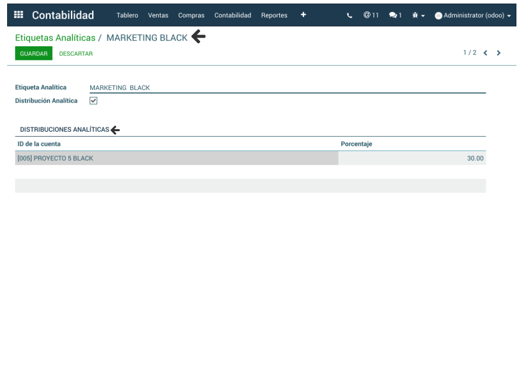 - De igual manera, si la cuenta analítica tiene asociada una Etiqueta Analítica ésta aparece en la sección Distribuciones Analíticas.