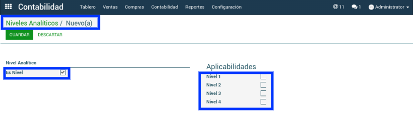 Módulo contabilidad > Configuración > Niveles > Niveles analíticos