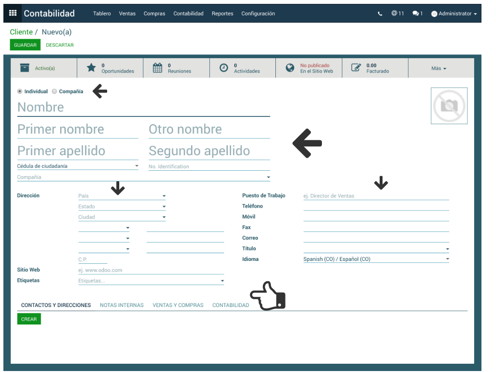 3. En las pestañas Contactos y Direcciones y Notas Internas, se