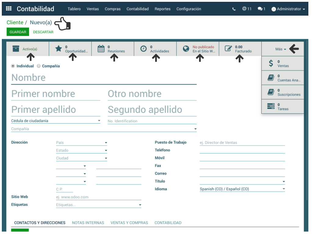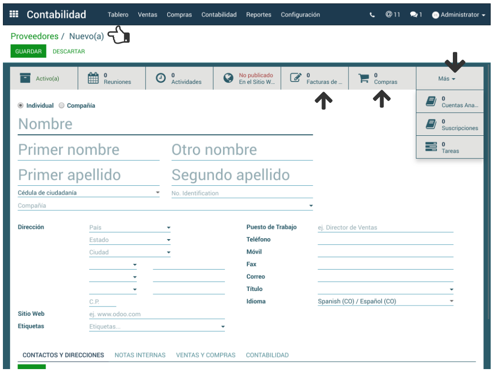 - Opción Más permite la visualización de información relacionada con Ventas, Facturas de Proveedor, Compras, Cuentas analíticas vinculadas a él, Suscripciones, Tareas.