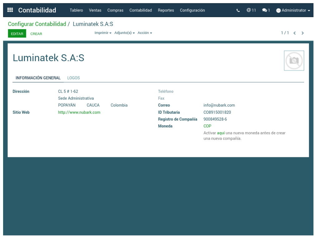 Se configura en este sub-menú toda la información relacionada con la compañía.