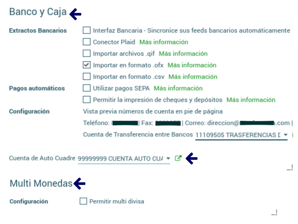 -Configuración: Se edita información del pie de página de la compañía, como números de contacto y página web. Así mismo, debe establecerse la Cuenta de Transferencia entre Bancos fundamental para el proceso de pagos, Tipo Transferencias Internas.