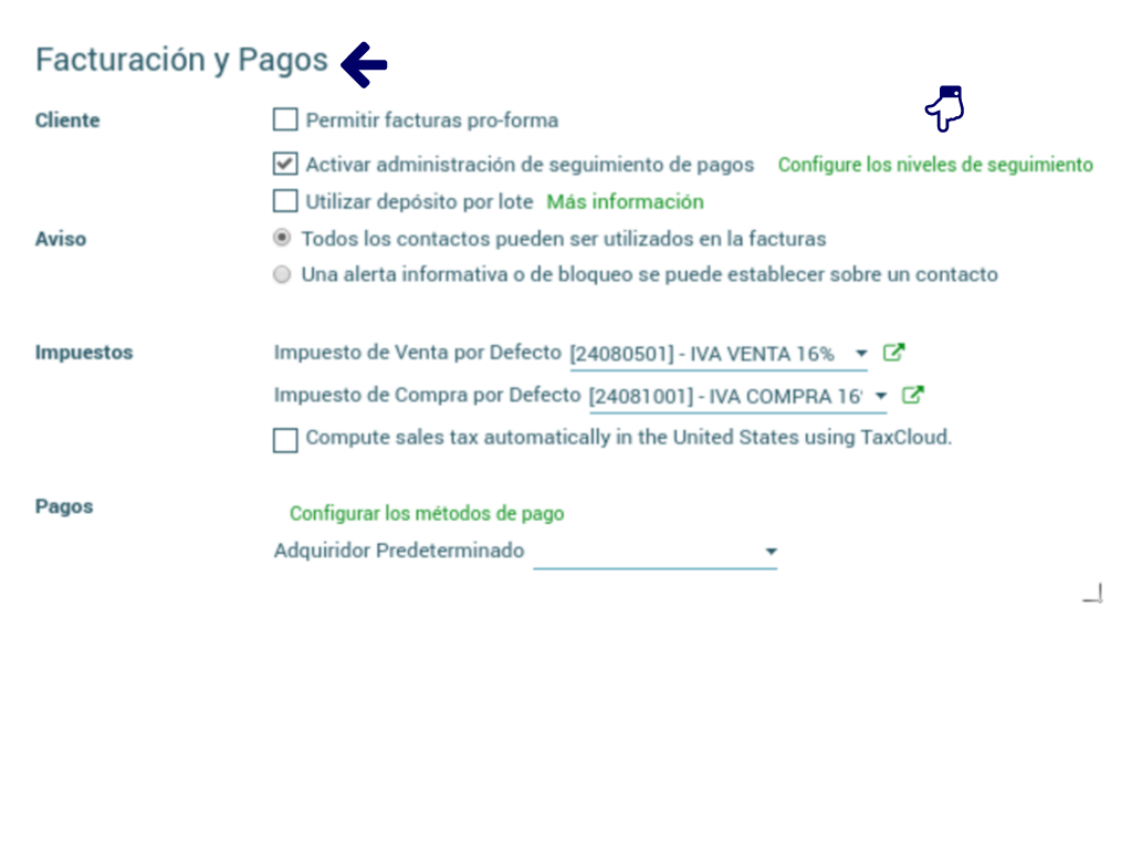 Pagos: Permite configurar los métodos de pago o elegir un Adquiridor predeterminado, por ejemplo, Transferencia Bancaria.