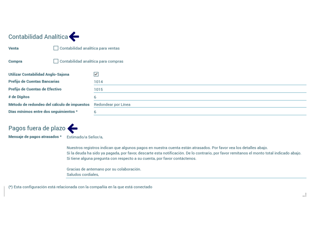 Establecer los prefijos para las cuentas bancarias y de efectivo. El número de dígitos y el Método de redondeo del cálculo de impuestos y los días mínimos entre dos seguimientos.