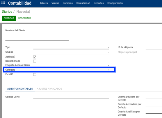 La asociación del diario a la categoría se realiza directamente desde el diario, seleccionando una categoría en el campo Category.