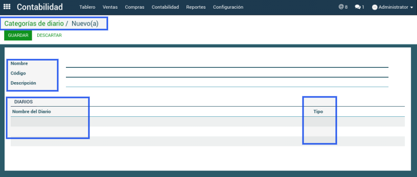 Módulo Contabilidad > Configuración > Diario > Editar o Crear