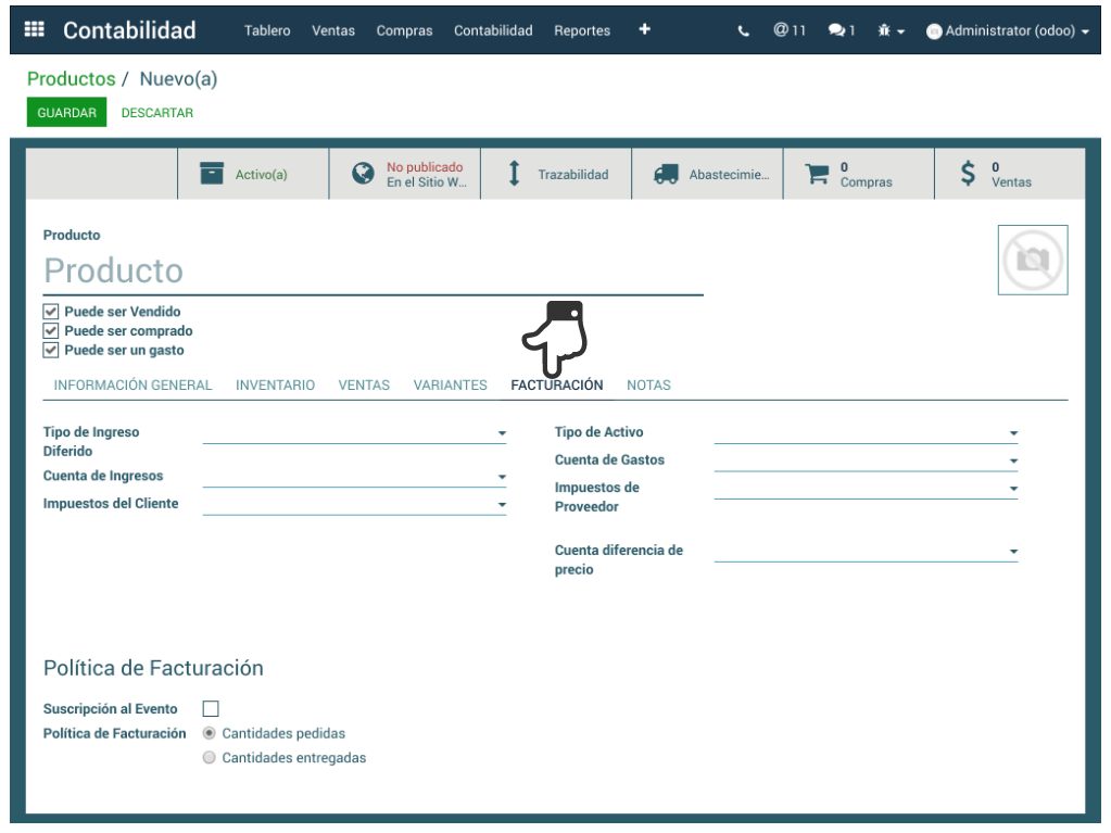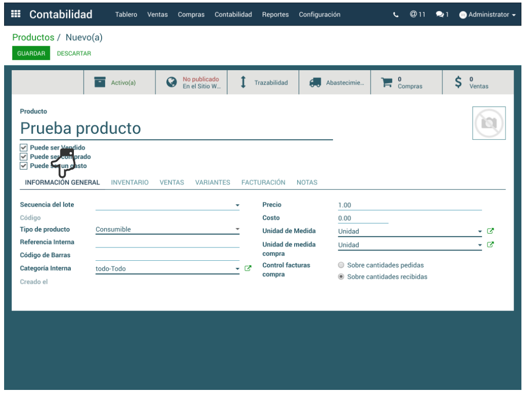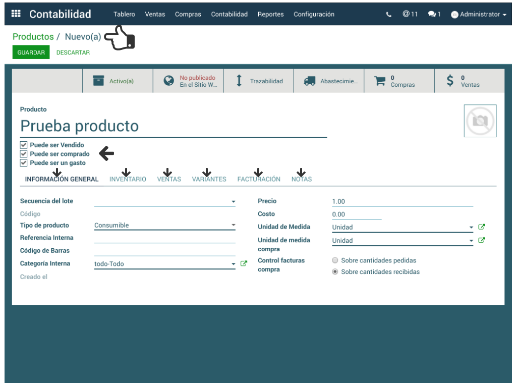 La creación del producto inicia con otorgarle un Nombre y seleccionar en los recuadros, si Puede ser Vendido, Puede ser Comprado o Puede ser un Gasto