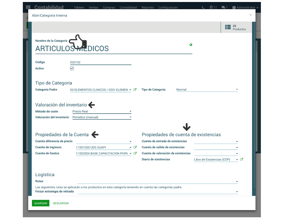 -1.6 Se elige una Categoría Interna de acuerdo a las características del producto. Esta categoría contiene aspectos relacionados con Valoración de Inventario, enlaza las Cuentas de Ingresos, de Gastos y define las Propiedades de cuenta de Existencias.