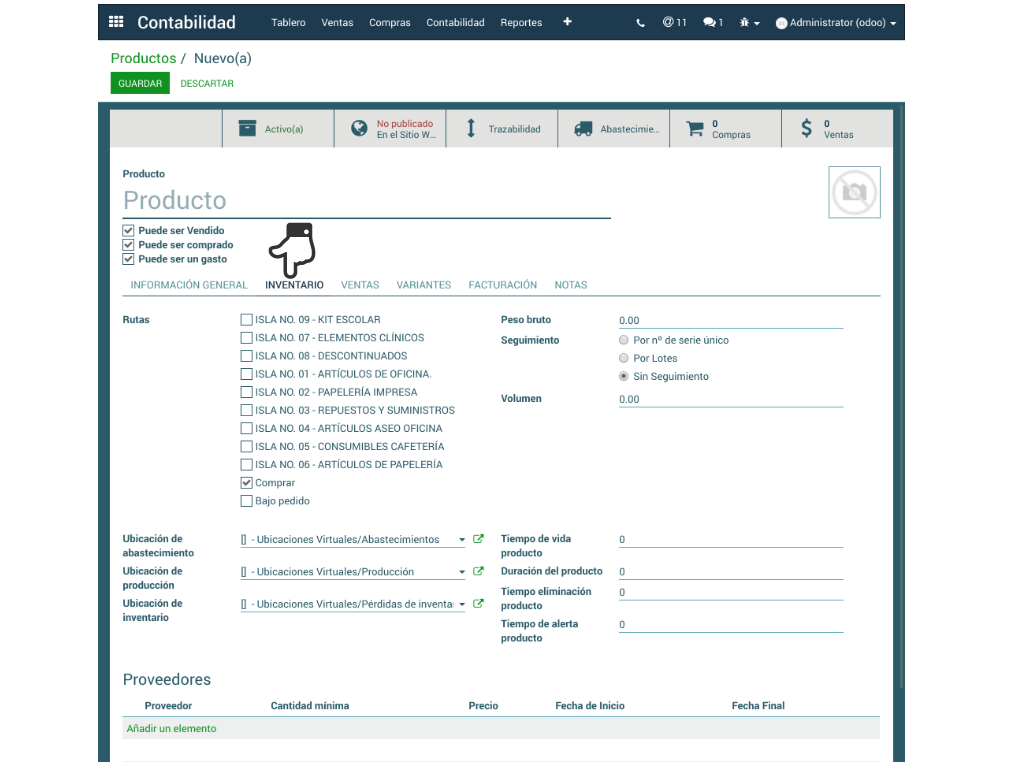 -2.3 Se define el Peso Bruto y algo importante, el Seguimiento del producto, si es por No de serie único, Por Lotes o si es un producto Sin seguimiento. También se define su Volumen.