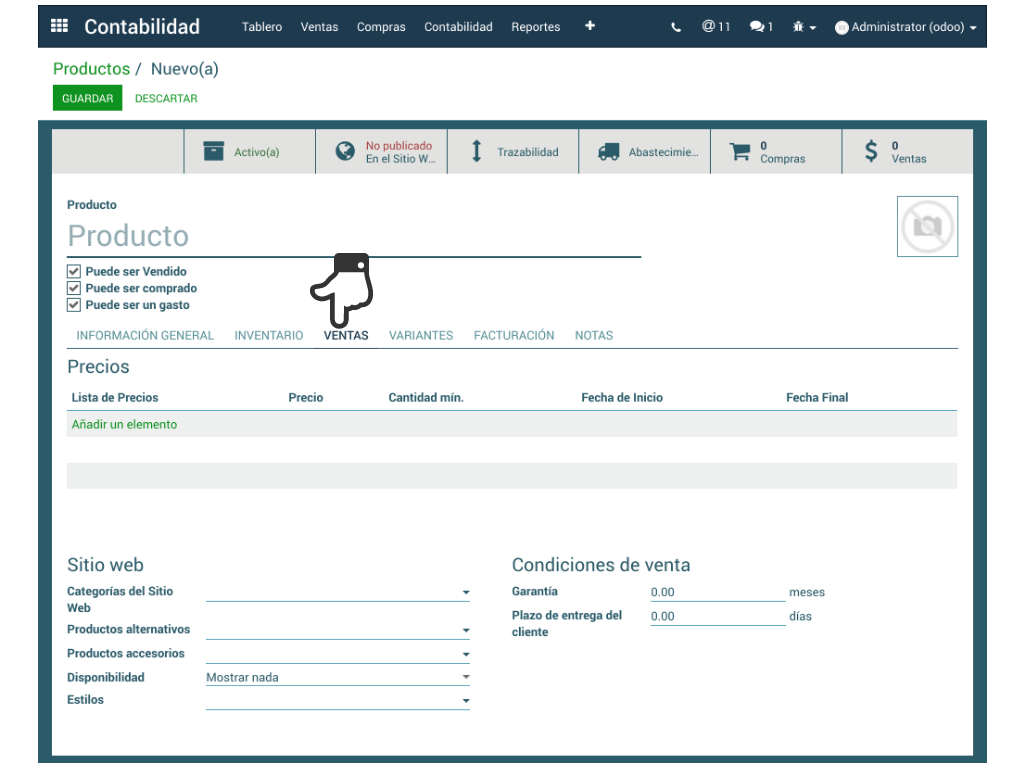 Menú contabilidad > Ventas > Productos Vendibles > Crear