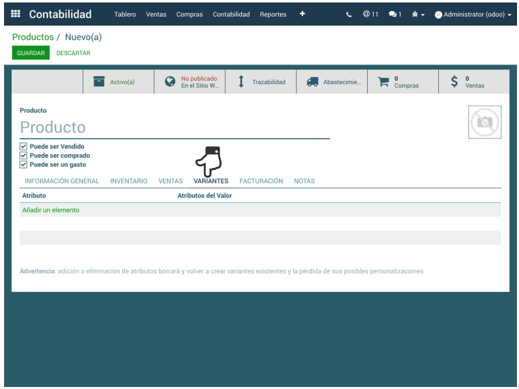 En Odoo, las variantes de productos se añaden para administrar productos que tienen diferentes variaciones como talla, color, etc. Esta opción, permite administrar el producto a nivel modelo. Solamente se debe dar clic en Añadir un elemento.