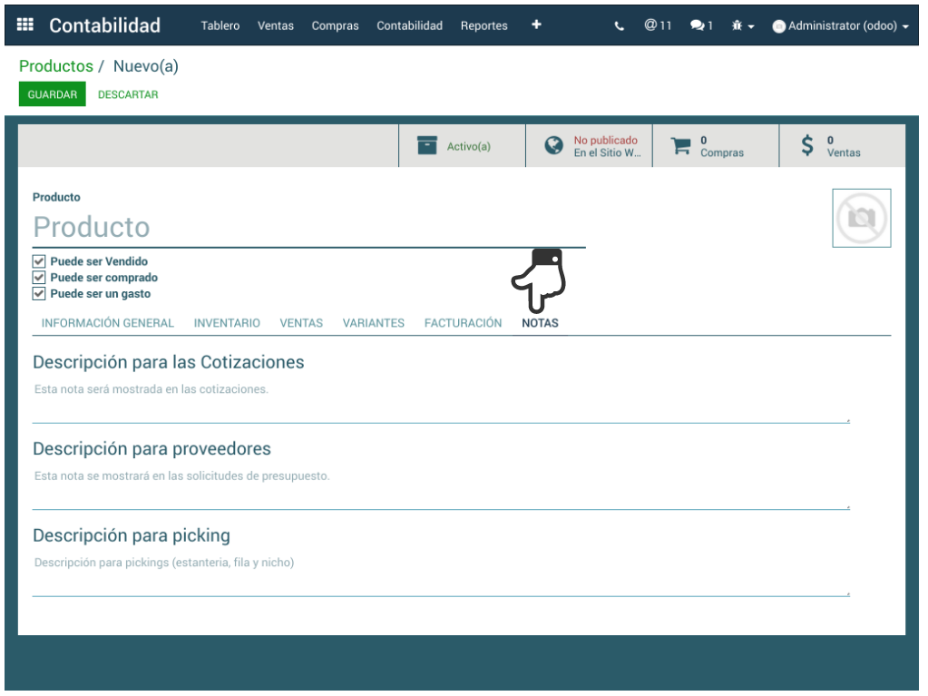 Permite redactar notas del producto para que aparezcan en Cotizaciones, Proveedores o Picking.