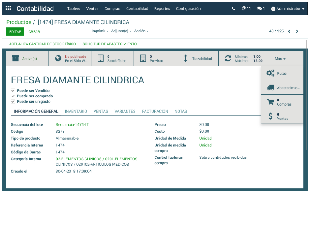 - Dando clic en el botón MÁS, sistema permite tener un referente de Abastecimientos, de Compras y de Ventas.