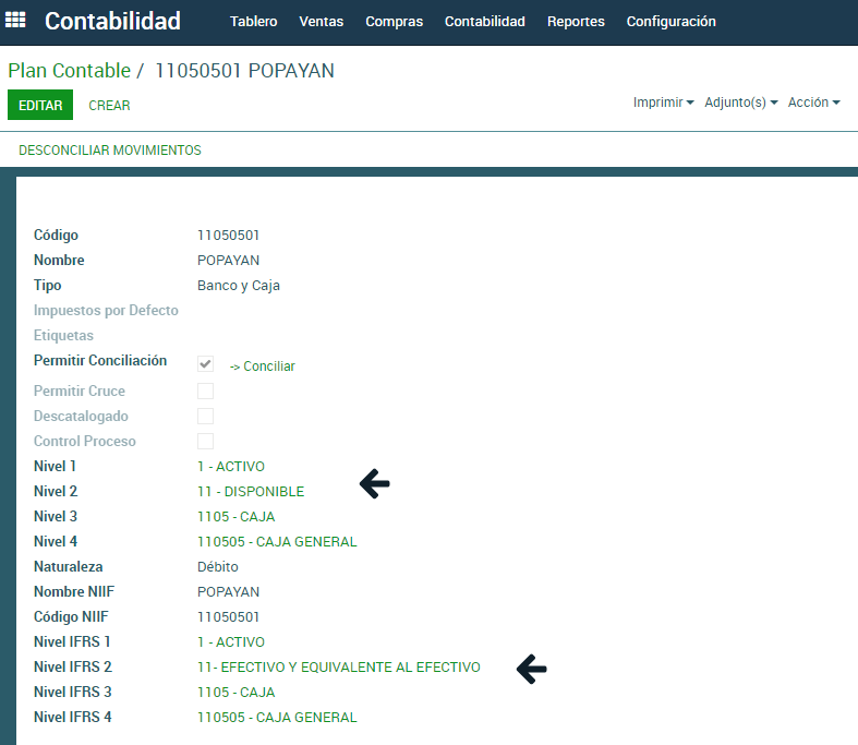 Tiene la opcion de configurar las cuentas cuyo nombre o parte del codigo son diferentes para efectos de las NIIF, mediante una asignacion de niveles contables para NIIF que permite una dinámica y flexible creación y alimentación de los nuevos conceptos NIIF.