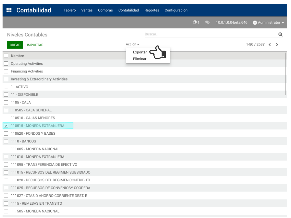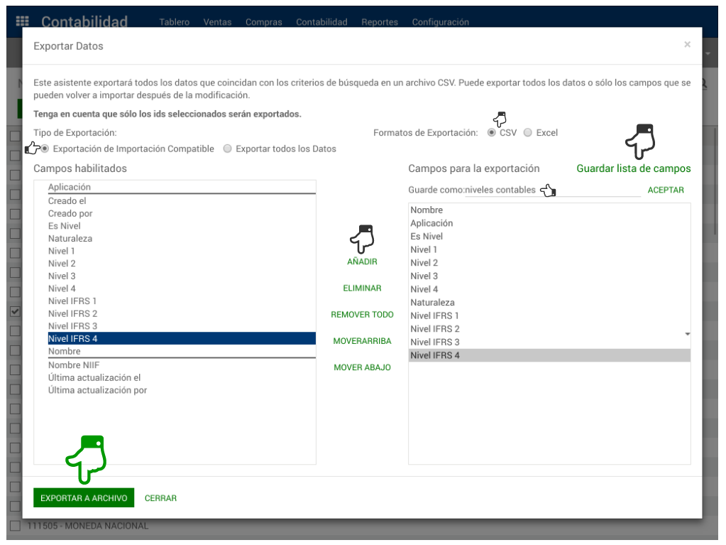 Para el caso específico del archivo maestro de Niveles Contables, los campos a exportar son los siguientes: