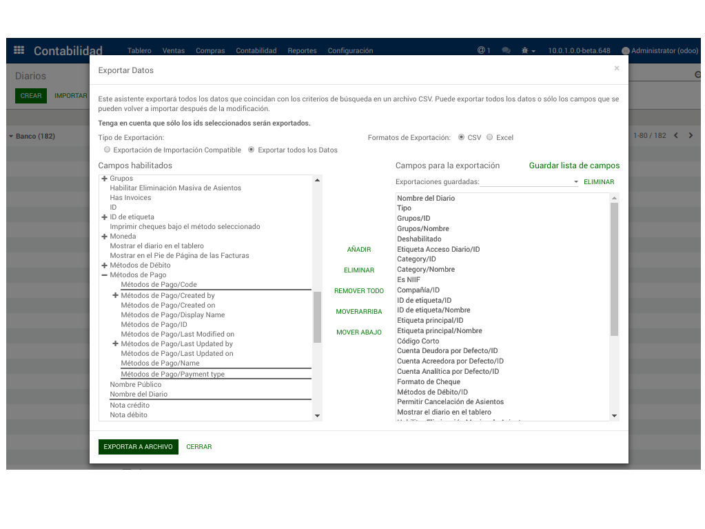 Para el caso específico del archivo maestro de Diarios Tipo Banco, los campos a exportar son los siguientes: