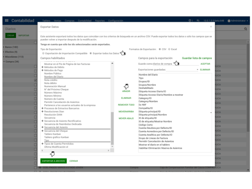 Para el caso específico del archivo maestro de Diarios Tipo Compra, los campos a exportar son los siguientes: