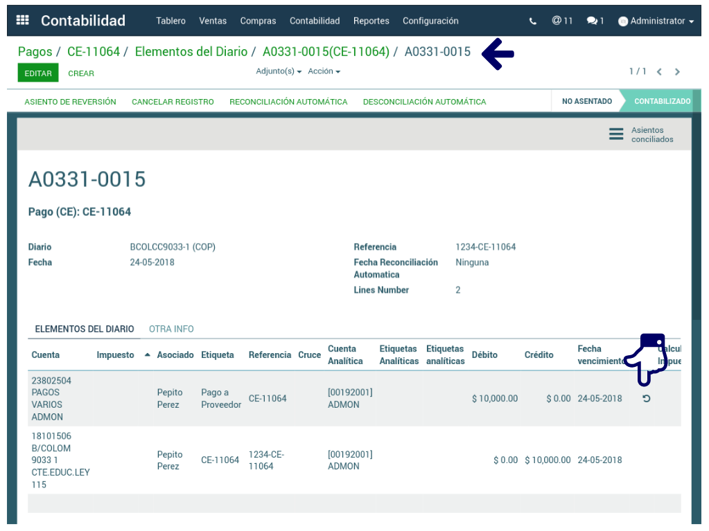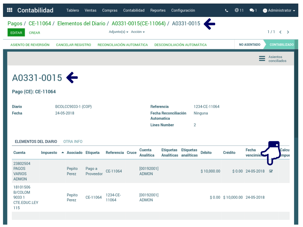 Habiendo dado clic en el botón Elementos del diario, desde el pago realizado, se da clic en el enlace del Asiento Contable y clic en el recuadro Conciliar que se encuentra en la línea de factura, al lado de la fecha de vencimiento