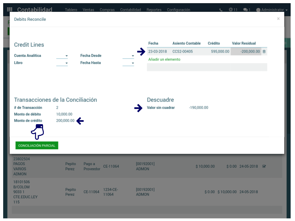 Finalmente, se da clic en Conciliación (para este caso Parcial) y al volver al documento se muestra un ícono diferente que evidencia que se trata de una línea conciliada, la cual puede volver a desconciliarse dando clic sobre el mismo ícono.