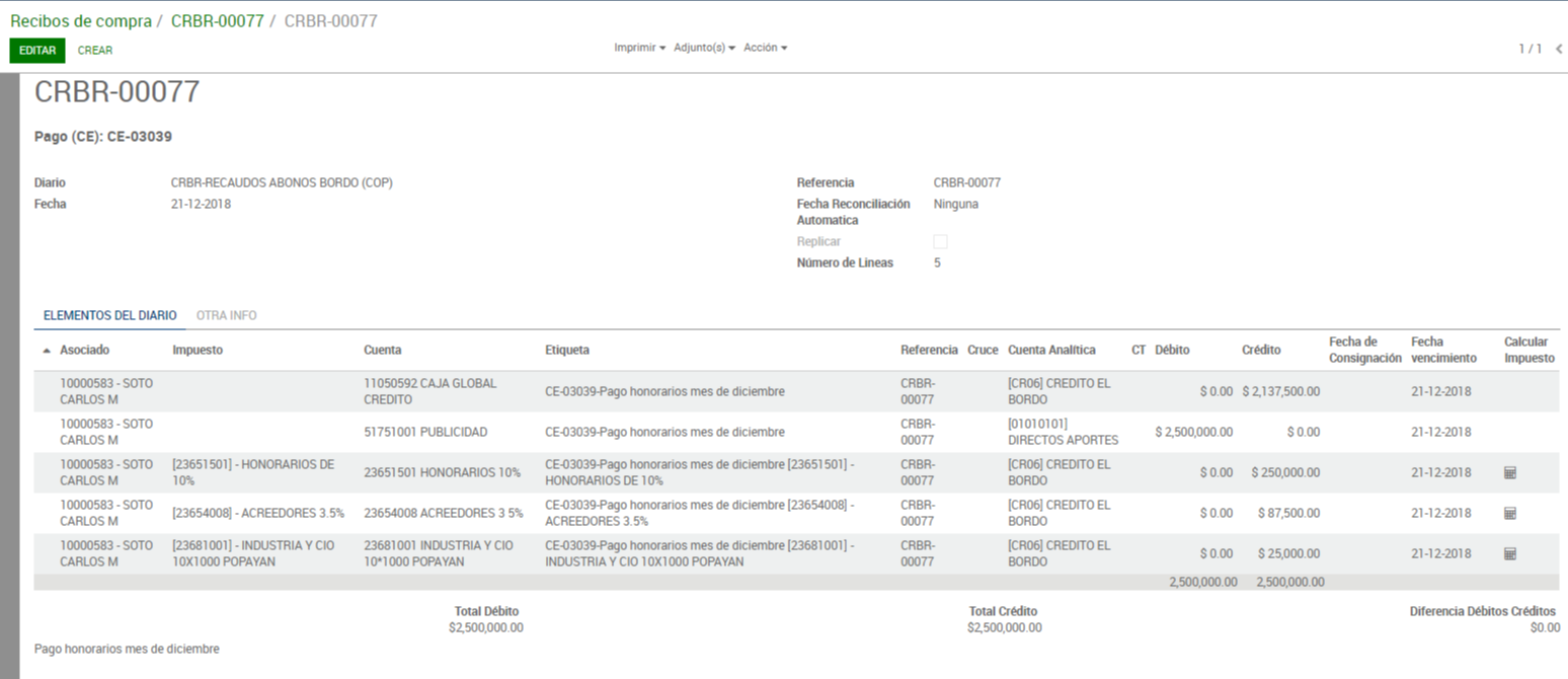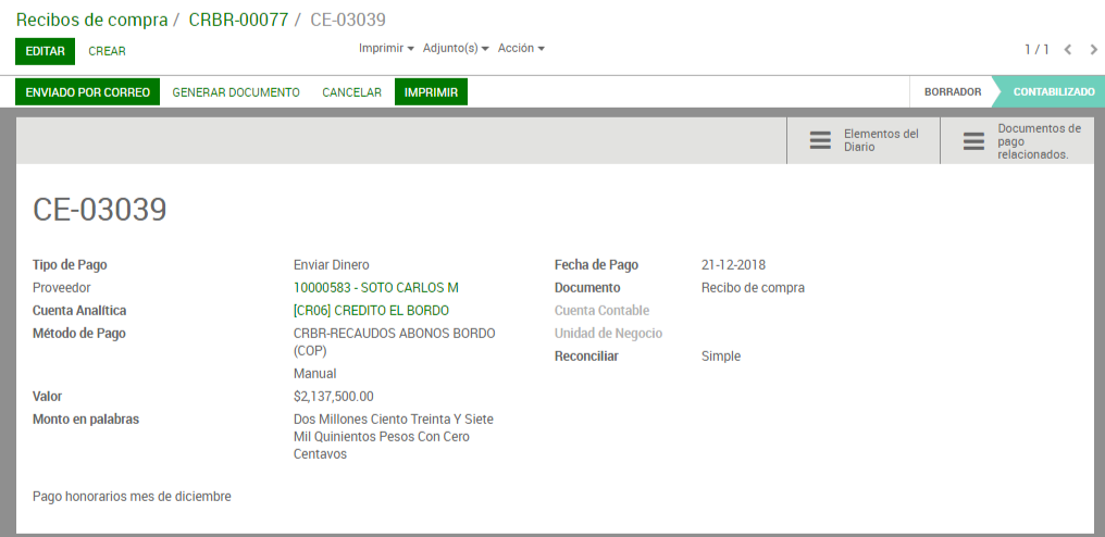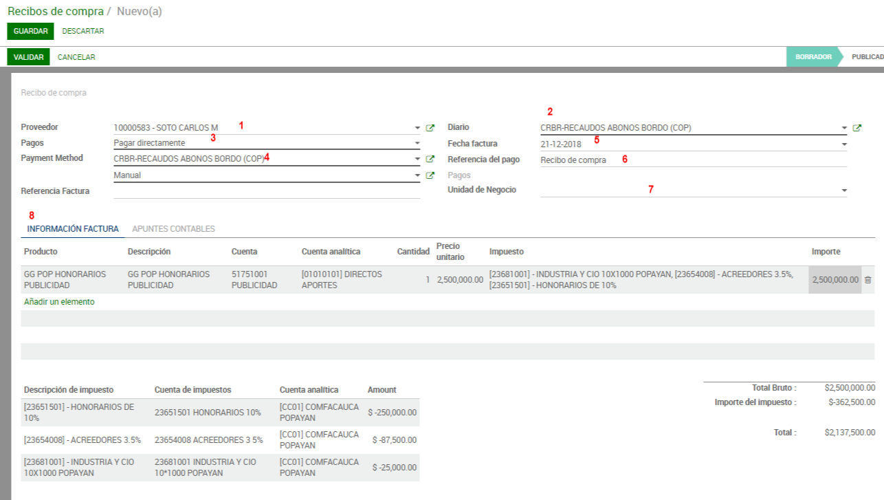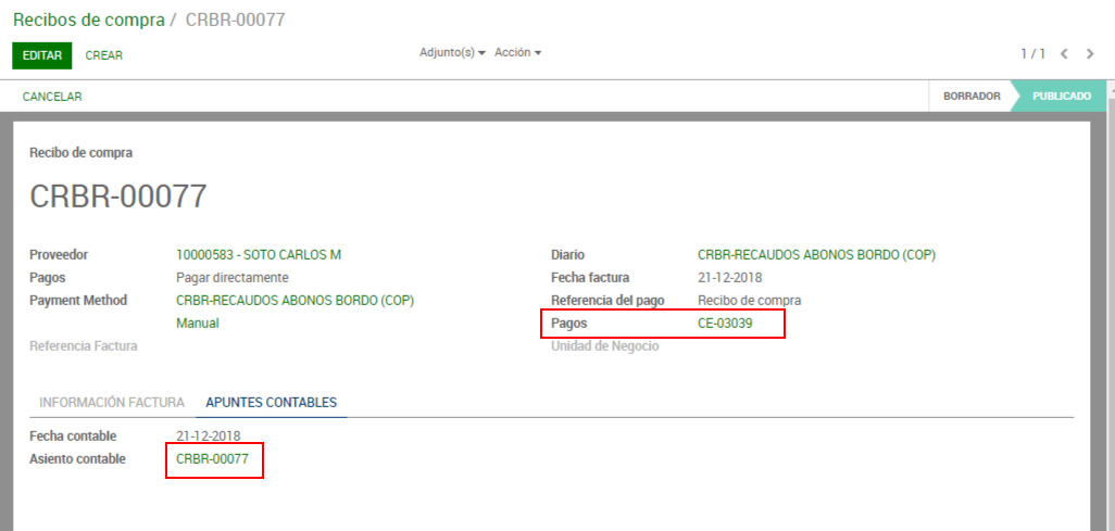 - Guardar y validar. Al validar se crea el asiento contable del recibo de compra y el pago