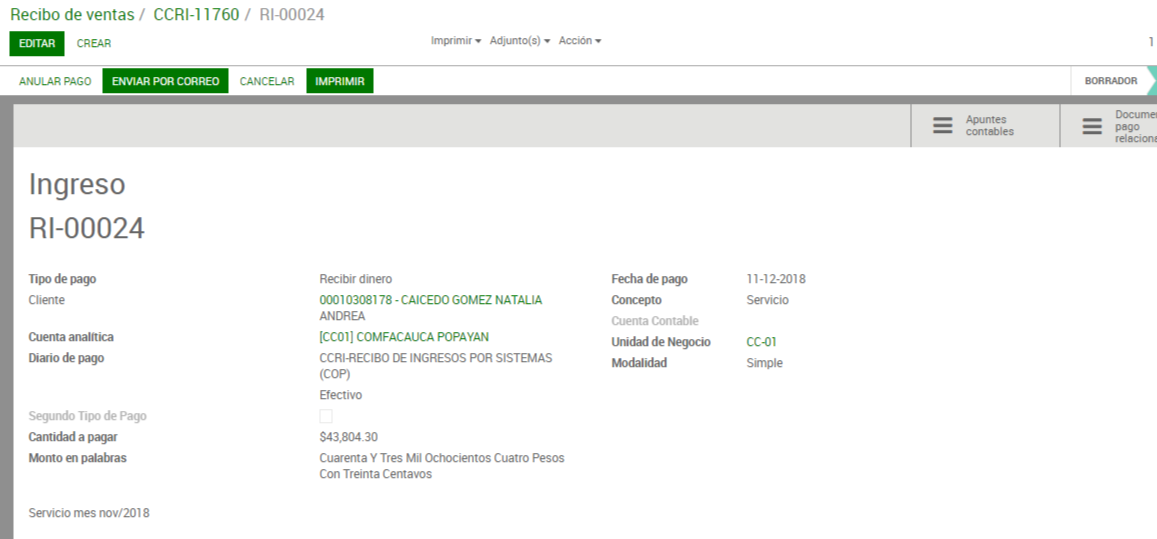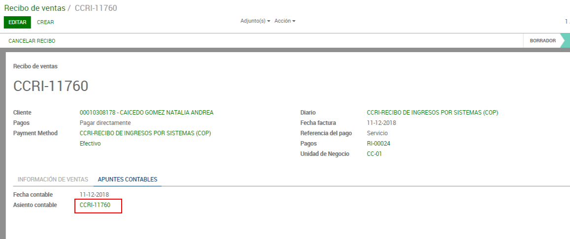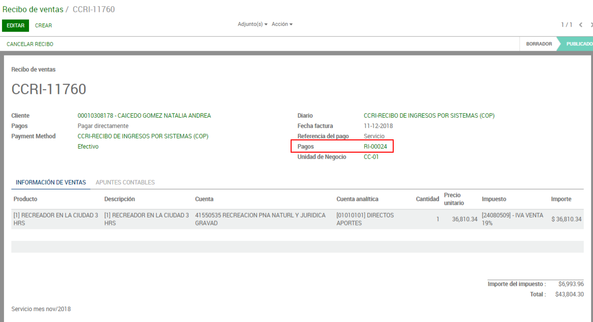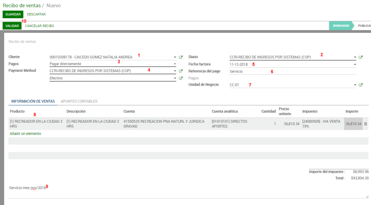 - Guardar y validar. Al validar se crea el asiento contable del recibo de ventas y el pago