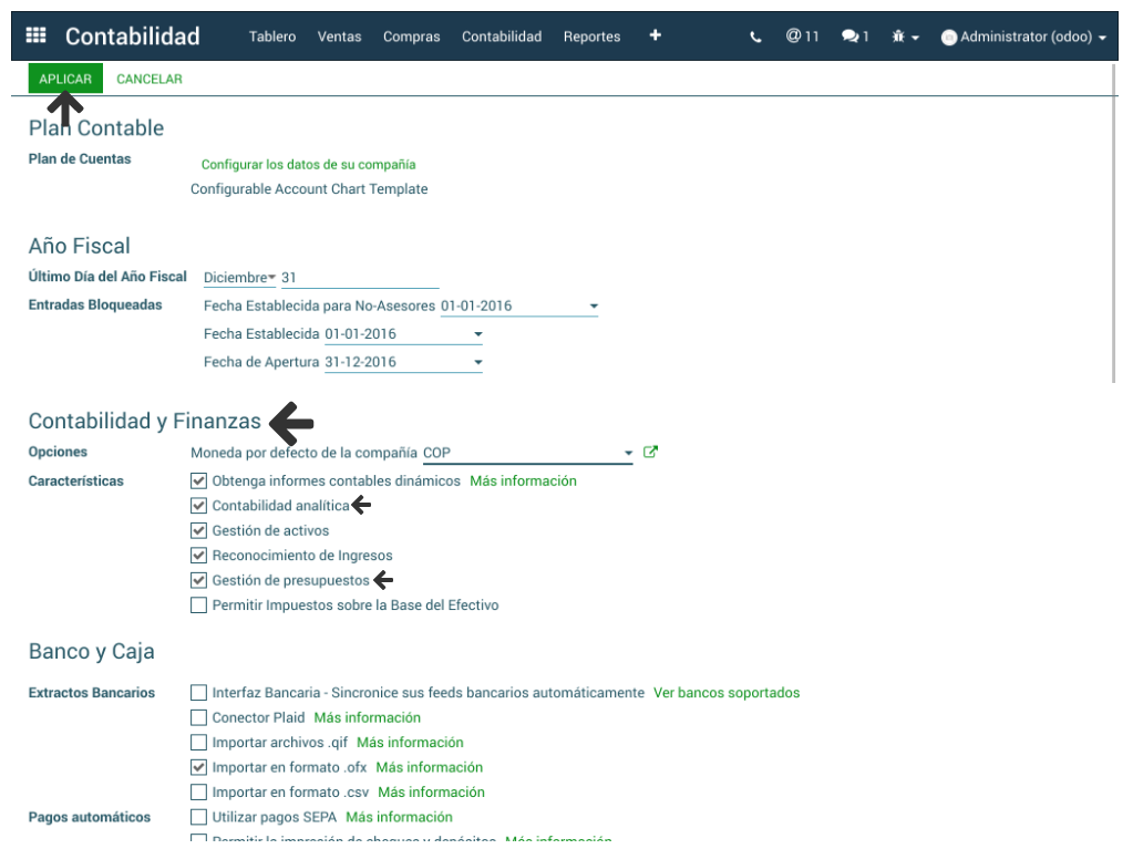 > Contabilidad > Configuración > Ajustes > Contabilidad y finanzas > y activar las opciones de Contabilidad Analítica y Gestión de Presupuestos.