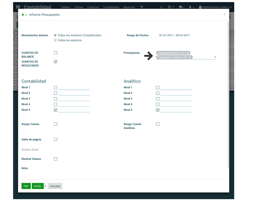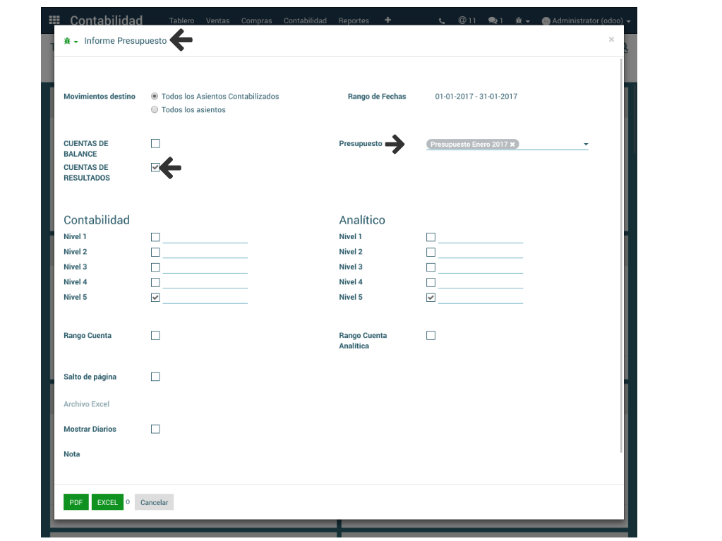 Para la generación del informe de presupuesto debe tenerse en cuenta la activación del campo Cuentas de Resultado y seleccionar los Presupuestos a consultar, puede ser uno o varios. Al igual que los demás reportes se puede elegir un nivel en las cuentas contables o analíticas.