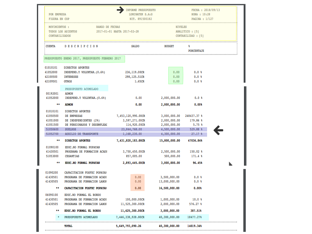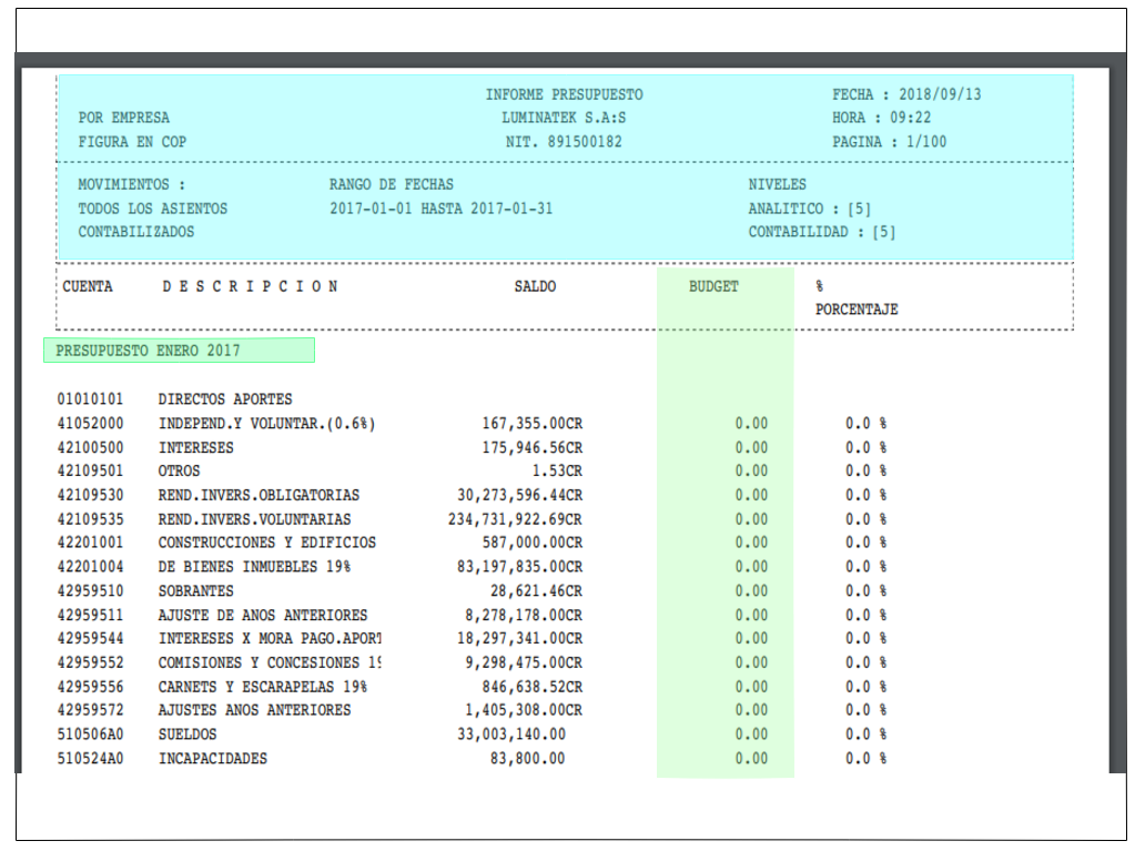 El informe de presupuesto tiene como objetivo no solamente comparar cifras entre montos previstos y montos ejecutados; también es poder detectar qué cuentas auxiliares presentan ejecución en el mismo periodo pero que no cuentan con un presupuesto asignado.