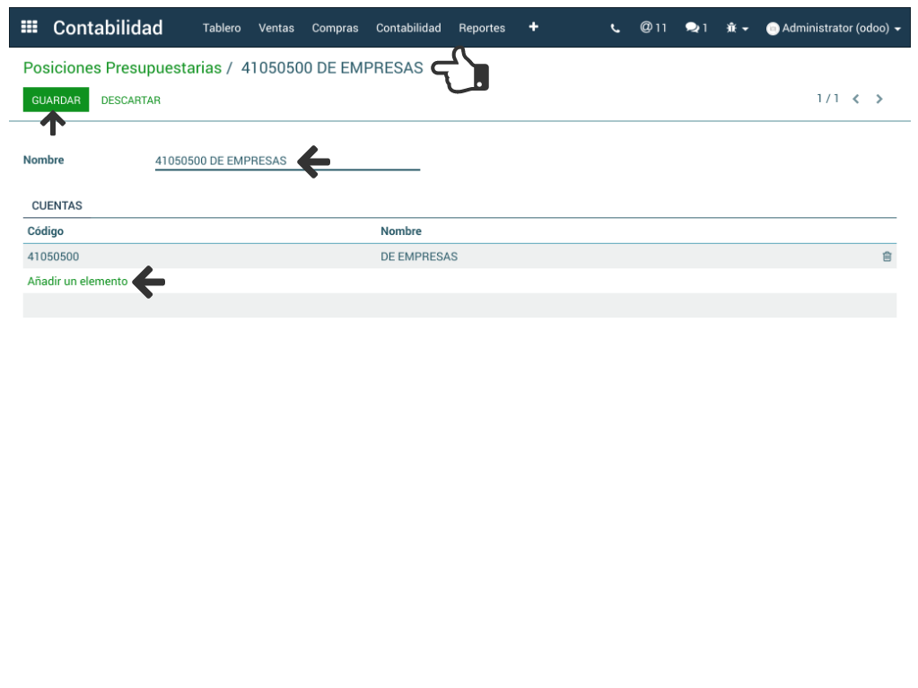 - Dando clic en Crear: Se da un Nombre a la posición presupuestaria (puede ser el mismo de la cuenta auxiliar). Acto seguido, se da clic en Añadir elemento en donde se selecciona la cuenta contable o se crea una directamente. Clic en Guardar. Se repite el proceso tantas posiciones se requiera crear.