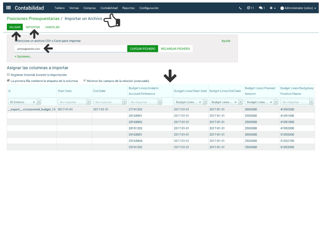 Es el mismo proceso descrito en Importar Posiciones Presupuestarias pero esta vez incluye los campos de las cuentas analíticas, el monto previsto, el periodo etc.