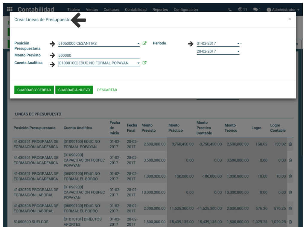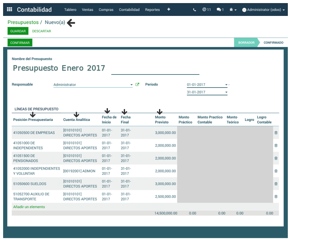 Al terminar la configuración de las líneas de presupuesto, ya sea a través de creación o importanción, los campos Posición presupuestaria, Cuentas analíticas, Fechas de Inicio y Final y Monto Previsto son diligenciados.