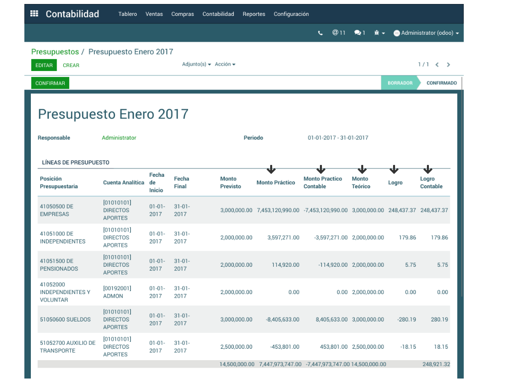 Monto Práctico: Representa el valor actual registrado en las posiciones presupuestarias y sus cuentas analíticas.