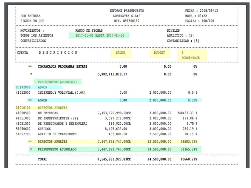 La estructura del reporte es la misma. El cambio como tal es en la sección de presupuesto acumulado donde suma valores, si comparte la misma cuenta analítica.