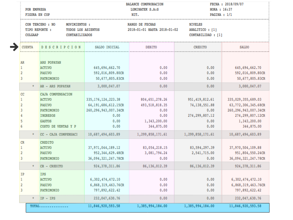 El reporte da prioridad a la cuenta analítica, seguida de las cuentas contables y si se hubiera solicitado con Terceros, éste ocuparía el tercer lugar. Al final del reporte se muestra el Total por columna.