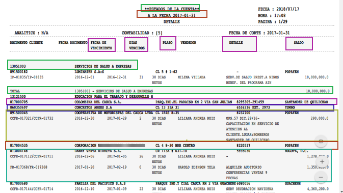 Este reporte permite conocer el Saldo de los documentos detallando la Cuenta Contable, el Asociado, el Documento, la Fecha de Vencimiento, Días Vencidos, el Plazo,el Detalle de la factura y totalizando por tercero y por cuenta contable o cuenta analítica.