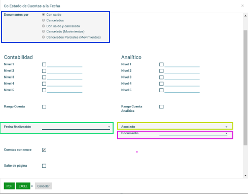 Seleccionando un nivel o rango de cuentas contables y analíticas específicas o no, este filtro extrae los documentos de acuerdo al Documento seleccionado.