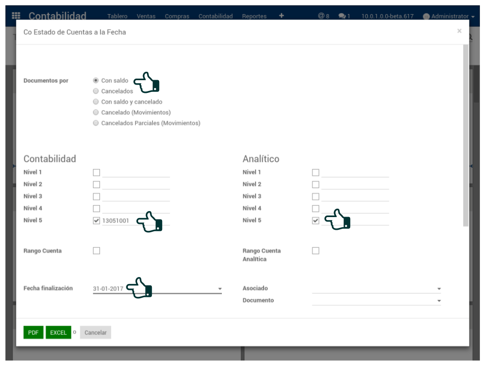 > Contabilidad > Reportes > Estado de Cuentas a la Fecha