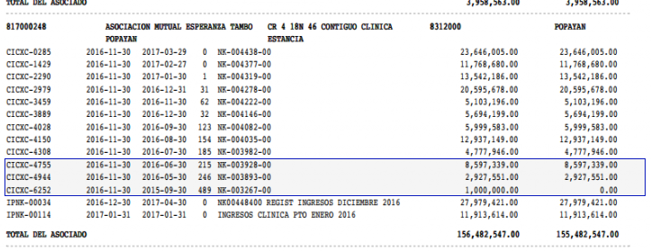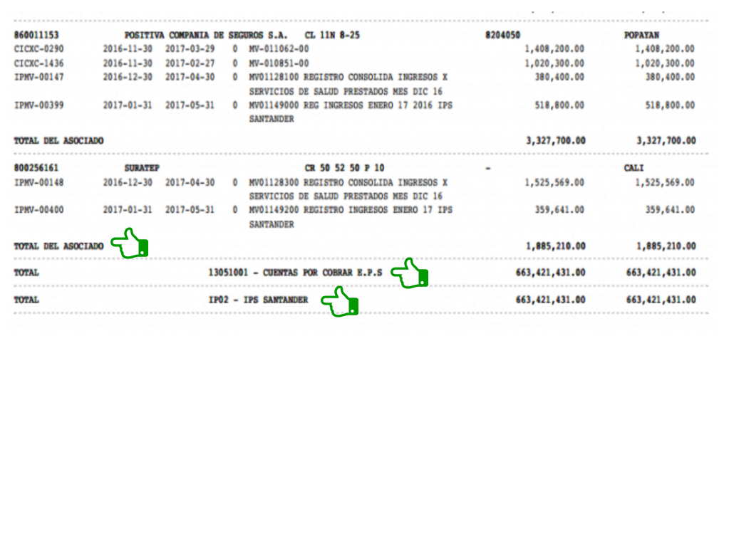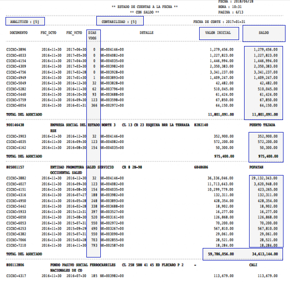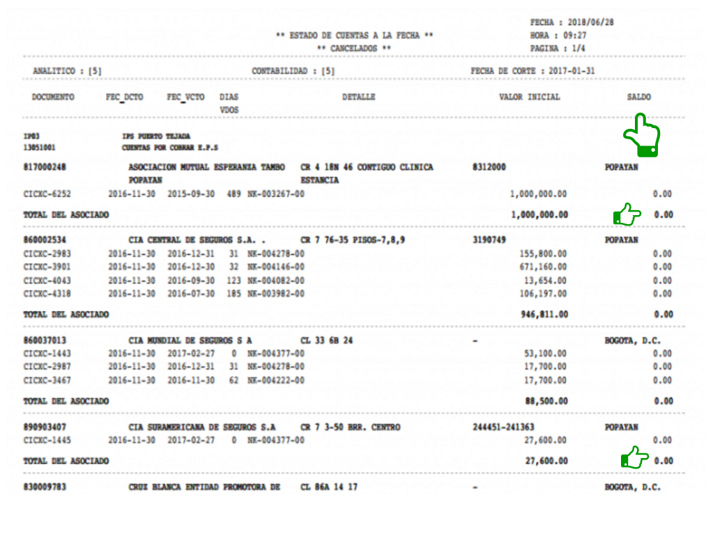 Combina los dos filtros anteriores mostrando los documentos con saldos en 0 (Cancelados) y los documentos que presentan saldo a la fecha de corte (Con saldo). Muestra las columnas saldo inicial y saldo. También totaliza por asociado.