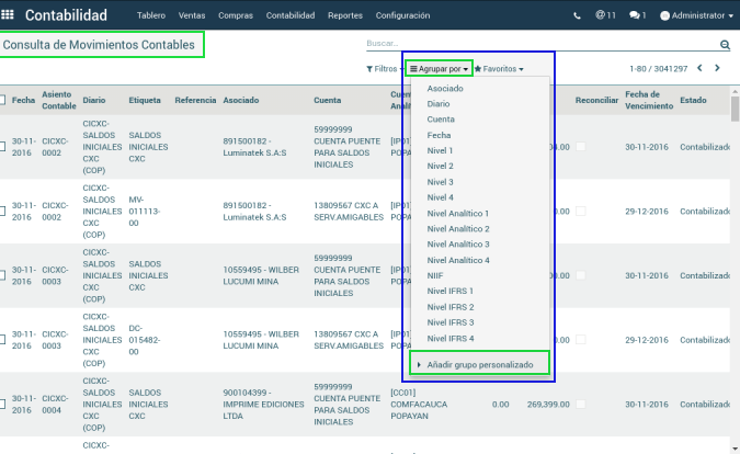 Este listado permite consultar los movimientos contables a través de diversos filtros o agrupaciones. Por ejemplo, agrupar por Asociado, Diario, Cuenta, Fecha, Estado del documento, Nivel específico Contable/Analítico o añadir algún Grupo Personalizado.